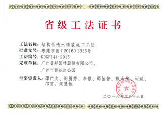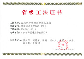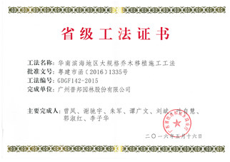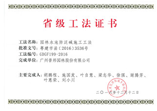 獲得省級工法16,含華南濱海地區(qū)大規(guī)格喬木移植施工工法(GDGF142-2015)、結(jié)構(gòu)性透水鋪裝施工工法(GDGF144-2015)、園林陡坡植物綠化施工工法(GDGF143-2015)、園林微污染水體凈化工法(GDGF198-2016)、園林水池防泛堿施工工法(GDGF199-2016)、園林生態(tài)景墻配置與施工工法(GDGF279-2017)、減低樓板荷載的節(jié)約型綠化種植施工工法(GDGF278-2017)、園林建筑免模板施工工法(GDGF674-2018)、園林水體生態(tài)景觀營造施工工法(GDGF673-2018)、華南地區(qū)生態(tài)雨水花園營建工法(GDGF202-2019)、華南地區(qū)輕型屋頂綠化營建工法(GDGF203-2019)、濱海土壤排鹽堿及景觀營建施工工法(GDGF204-2019)等。