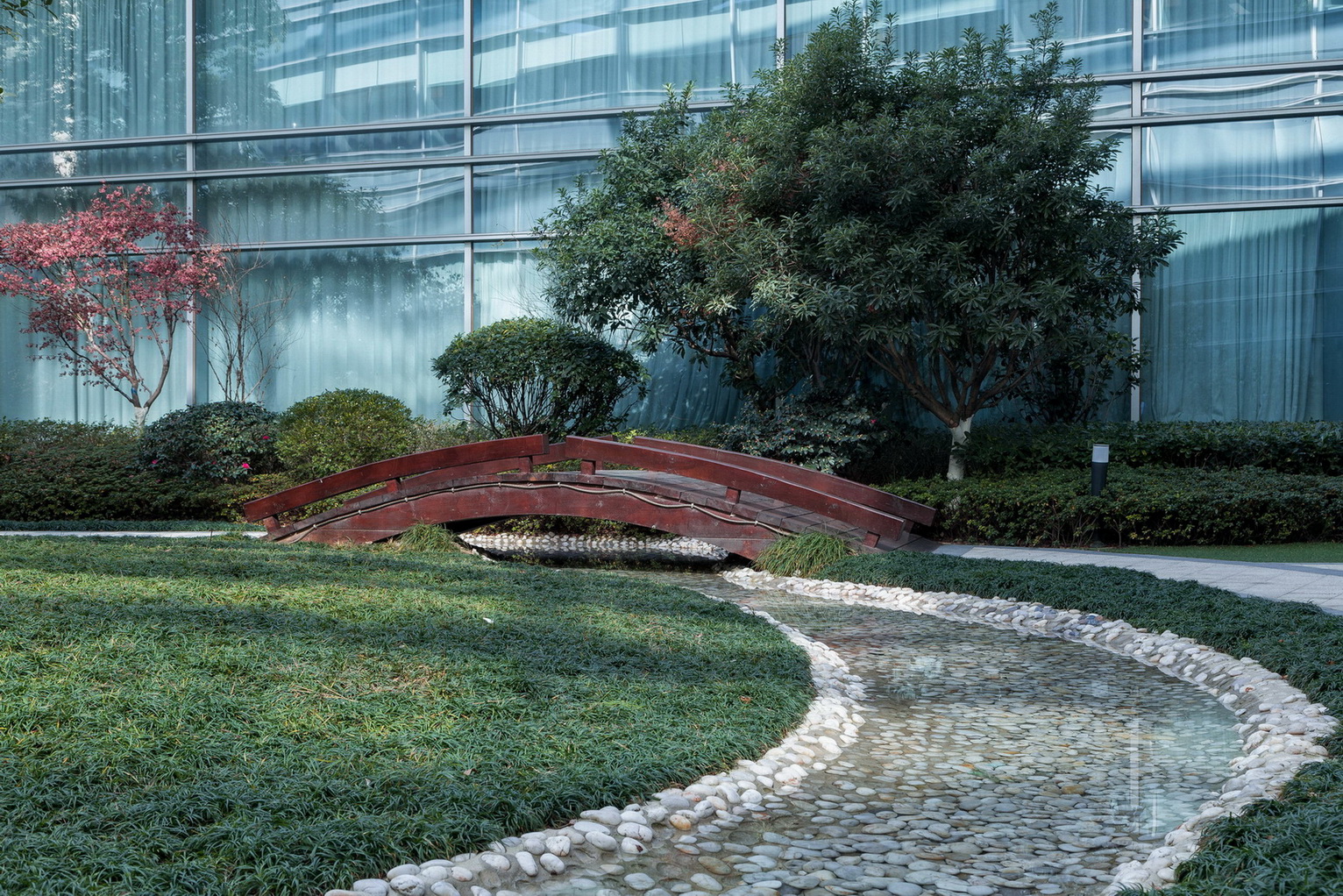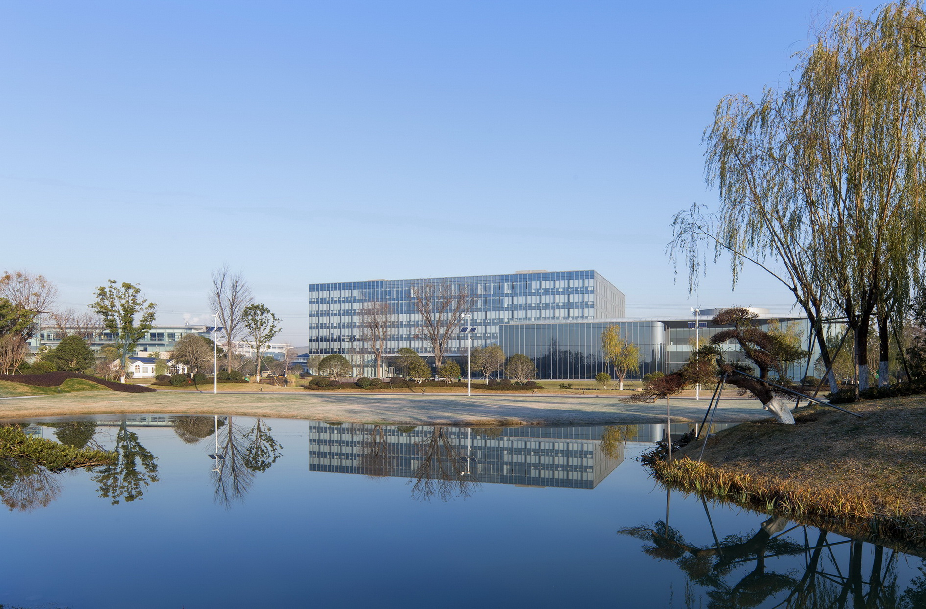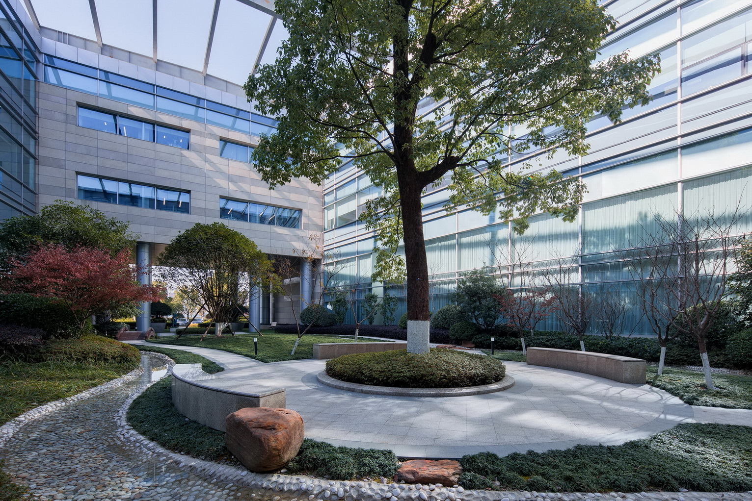 蘇州協(xié)鑫工業(yè)應(yīng)用研究院是協(xié)鑫集團(tuán)總部所在地,其主要滿足協(xié)鑫集團(tuán)及關(guān)聯(lián)企業(yè)在光伏、電力等領(lǐng)域的科研需求。項(xiàng)目采用了自然式園林景觀風(fēng)格,整體大氣簡潔,地形起伏自然,層次分明;庭院結(jié)合自然水系,曲線流暢植物配置因形就勢,疏密有致。此外,由于項(xiàng)目地表水位高,植物生長易積水,普邦股份為此硏發(fā)設(shè)計(jì)岀可持續(xù)、美觀、低成本造價的樹木根部低成本自動排水系統(tǒng)構(gòu)造,該項(xiàng)成果也已獲得國家實(shí)用新型專利。