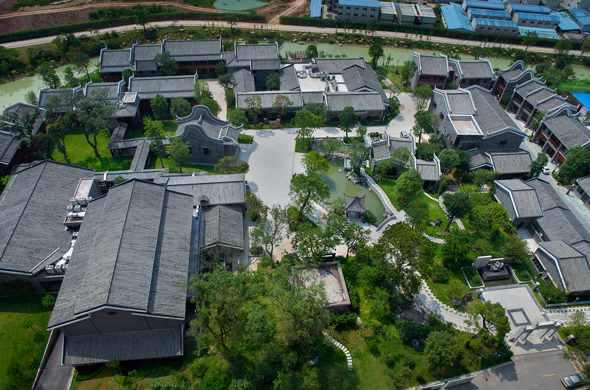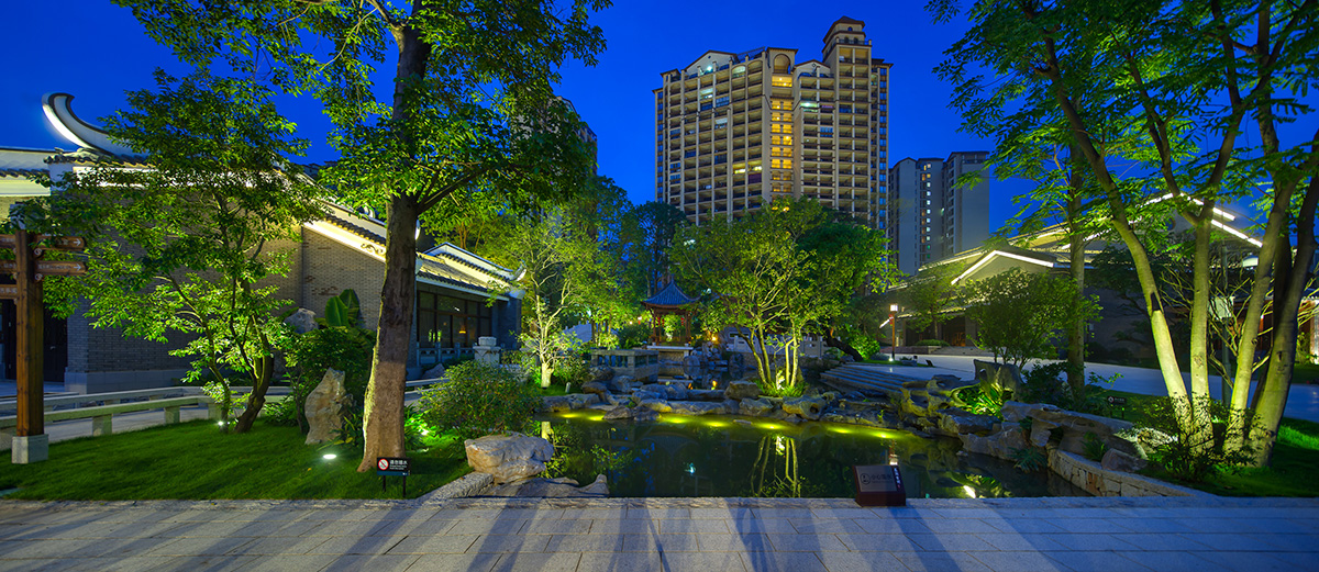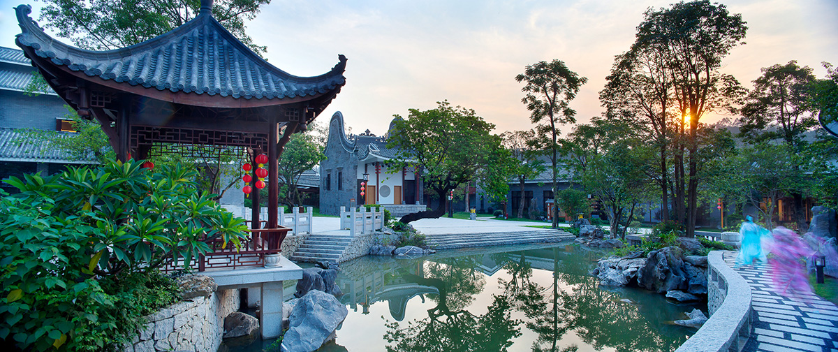龍門養(yǎng)生谷古村落以古典園林的“因地制宜”為造園原則,吸收傳統(tǒng)風水學的精髓,傳承中國人流傳于血脈中的審美情趣,在園林水景和造型設計上作出總體布局的考慮,使整個項目的園林水景流線更加通暢,同樣又保持蜿蜒曲折、曲徑通幽的園林景觀及其獨特的中式布局。設計師用植物圍合空間,結(jié)合原生古樹與嶺南建筑組織成精致典雅的庭院空間,表達出嶺南文化唯美不奢華,含蓄不張揚,精致不造作,親切質(zhì)樸,自然人性化的特征;入口景墻作為入口集散小廣場的視覺焦點,具有中式園林中照壁的作用;商業(yè)街景觀沿用嶺南元素和中式小品烘托商業(yè)氛圍,回歸最初的古樸生活。