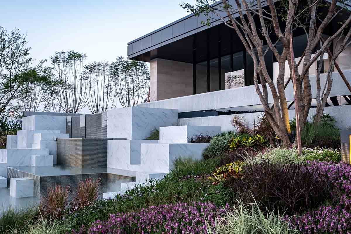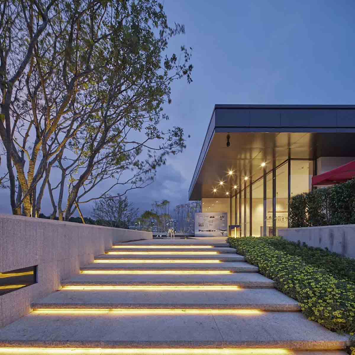 保利·公園壹號位于梅州客家之鄉(xiāng),于江南新城劍英湖畔,西側(cè)可飽覽劍英湖湖景。設(shè)計以自然為神韻,充分利用現(xiàn)場臺地的高差,景觀作為一種自然介質(zhì),遵循土地的肌理,演繹“高山流水”的主題。項目風格為現(xiàn)代中式,整體簡潔、輕盈、時尚,結(jié)合現(xiàn)有地形,通過跌級水景與植物堆坡的營造,將建筑與自然巧妙的融合,打造一個生態(tài)宜居的精品住宅景觀。
