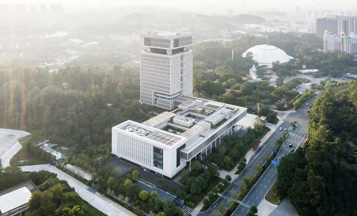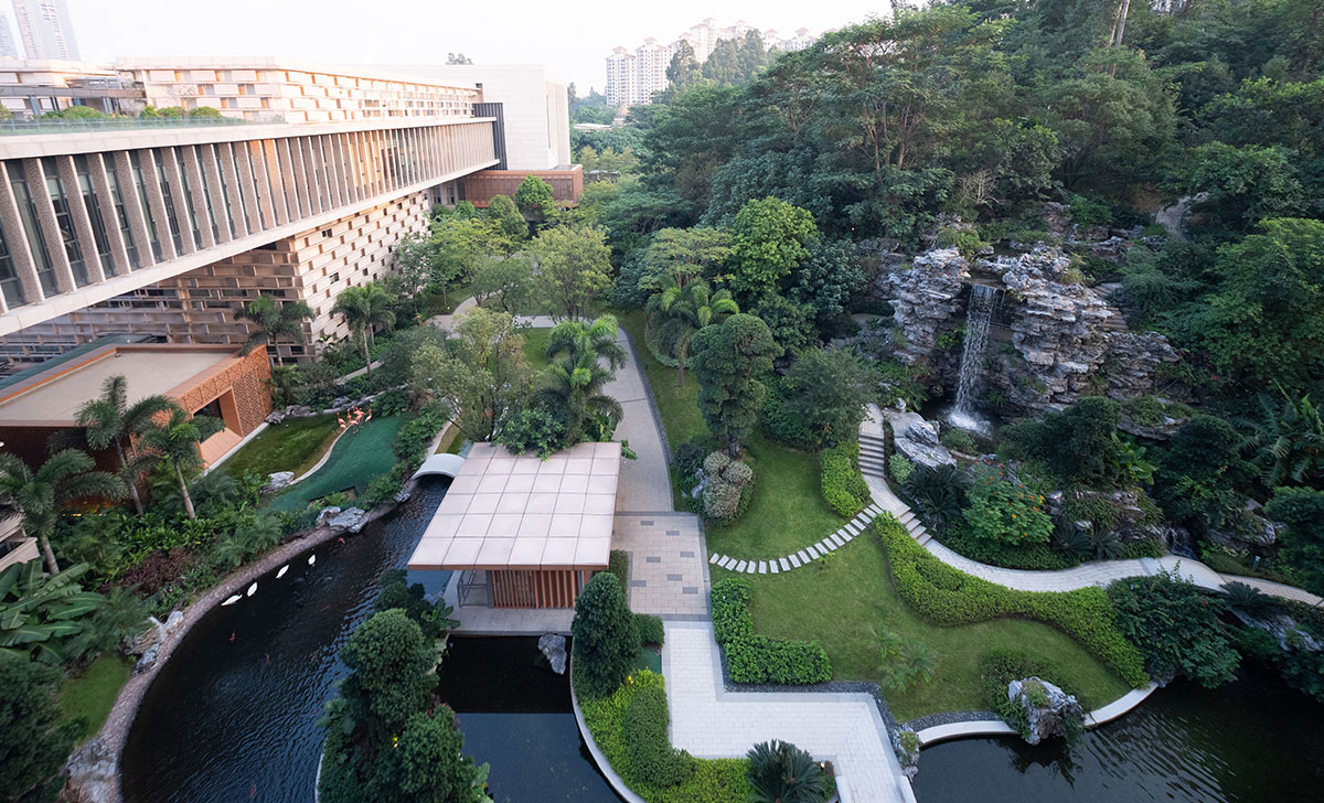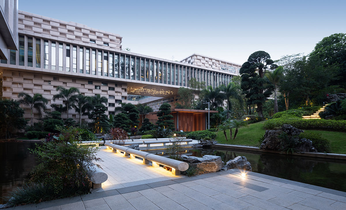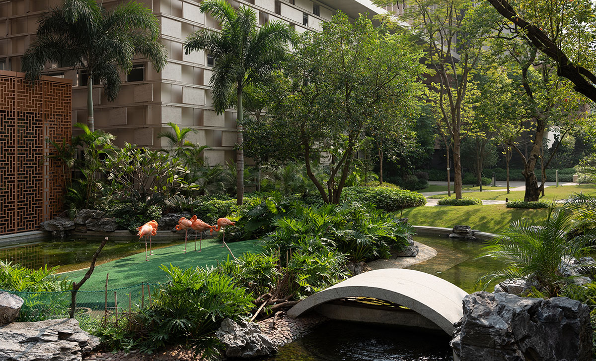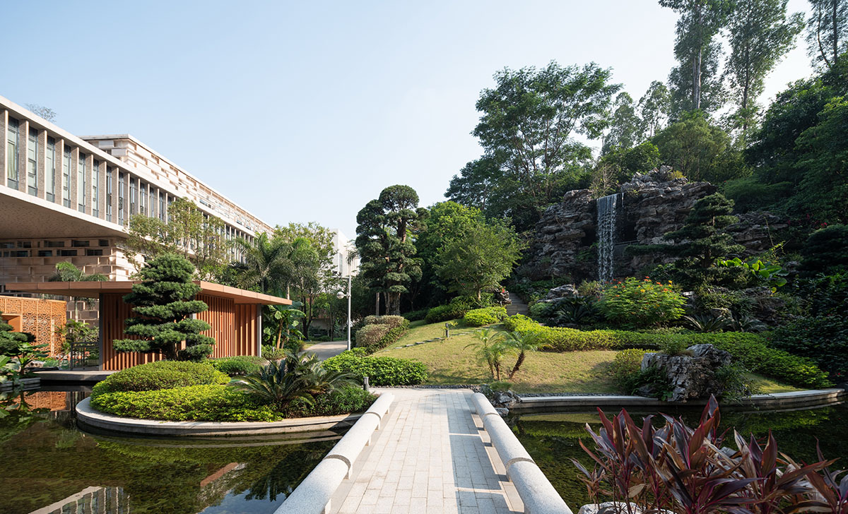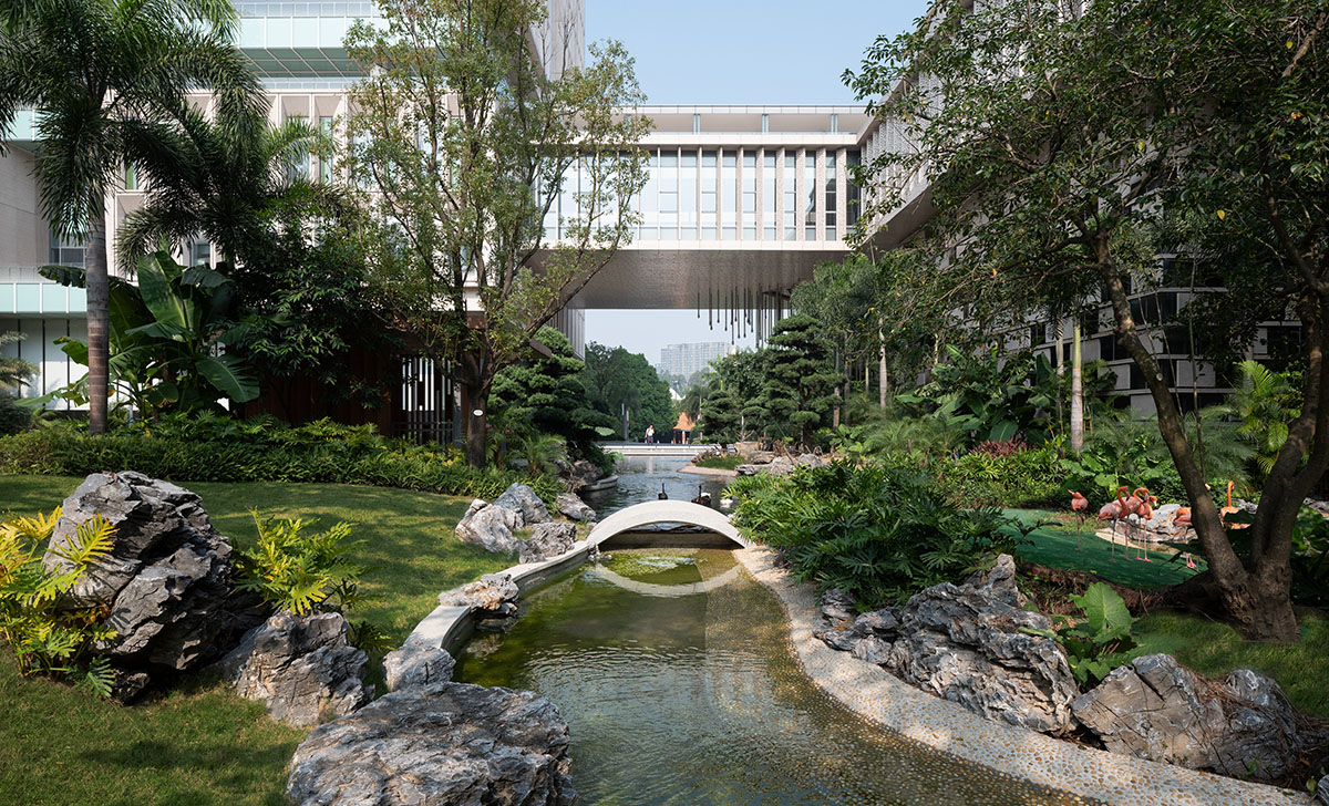 長隆集團總部大樓外部景觀以嶺南園林為原型,嵌入長隆文化元素, 打造具有嶺南特色的現(xiàn)代企業(yè)文化園林景觀體系。景觀設計著力解決建筑、自然、人以及動物之間的和諧相處。 將“網(wǎng)紅標志景觀”、現(xiàn)代生態(tài)景觀、嶺南精品園、半室內(nèi)山水、動物自然棲息地以及員工休閑地集合與空間之中,打造生態(tài)立體辦公超級綜合體。